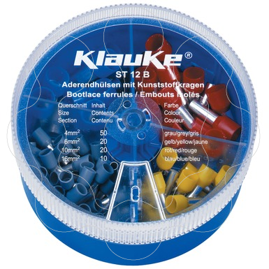 ST12B - Caixa c/100 ponteiras isoladas 4-16mm². Caixa de bolso com pontas isoladas 4-16 mm² ST 12 B. Caixa prática e resistente ao impacto.Ponteiras na Cor Alemã DIN.50x 4mm2 (Cinzento)20x 6mm2 (Amarelo)20x 10mm2 (Vermelho)10x 16mm2 (Azul)Para cores Francesas código ST32B