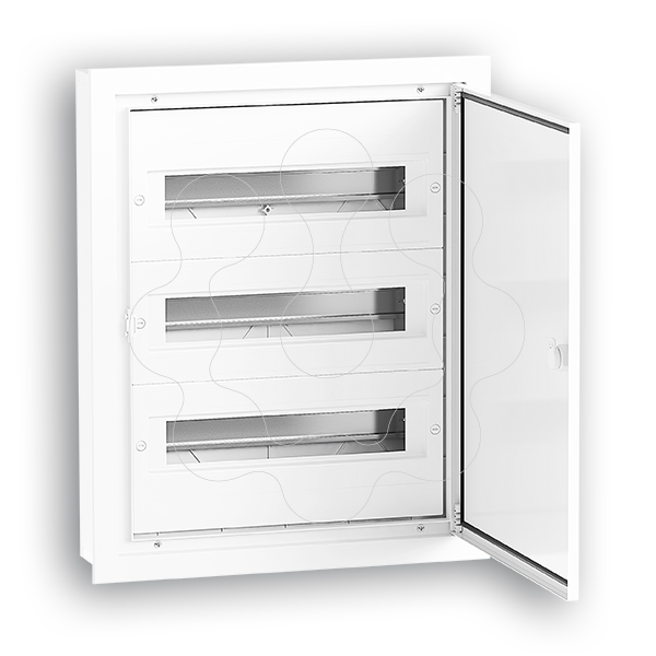 Caixas Quadro, de 16 a 72 módulos, com 125mm de profundidade. Inclui barramentos isolados neutro e terra, máscaras e etiquetas de marcação de circuitos. Chassi amovível.