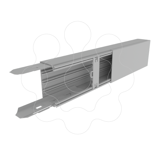 Calha Unex 60x110 em U23X. Perfil para distribuição de cabos com tampa exterior, apto para uso em intempérie. Tem compartimentação flexível para a condução e proteção de cabos elétricos e de comunicações. A base é perfurada a cada 250mm. Com a calha, é fornecida uma ponte a cada 0,5m e duas uniões. Estas peças vêm pré-montadas. Comprimento: 3m. Recomendadas ITED. Segurança: mecânica (proteção contra impactos IK10), elétrica (material isolante, IP4X montada na parede) e em caso de incêndio (ensaio do fio incandescente a 960 °C, não propagador da chama). A montagem da tampa realiza-se à pressão (não é necessário deslizar para montar). A ponte retém os cabos assegurando a fixação da tampa nos casos mais exigentes. As uniões unem mecanicamente os troços da calha garantindo a sua perfeita alienação, facilitando a montagem e fixação das bases sobre a superfície. Tanto a calha como os elementos de acabamento podem pintar-se. Separador móvel com montagem frontal. Cor: Cinzento RAL 7035.