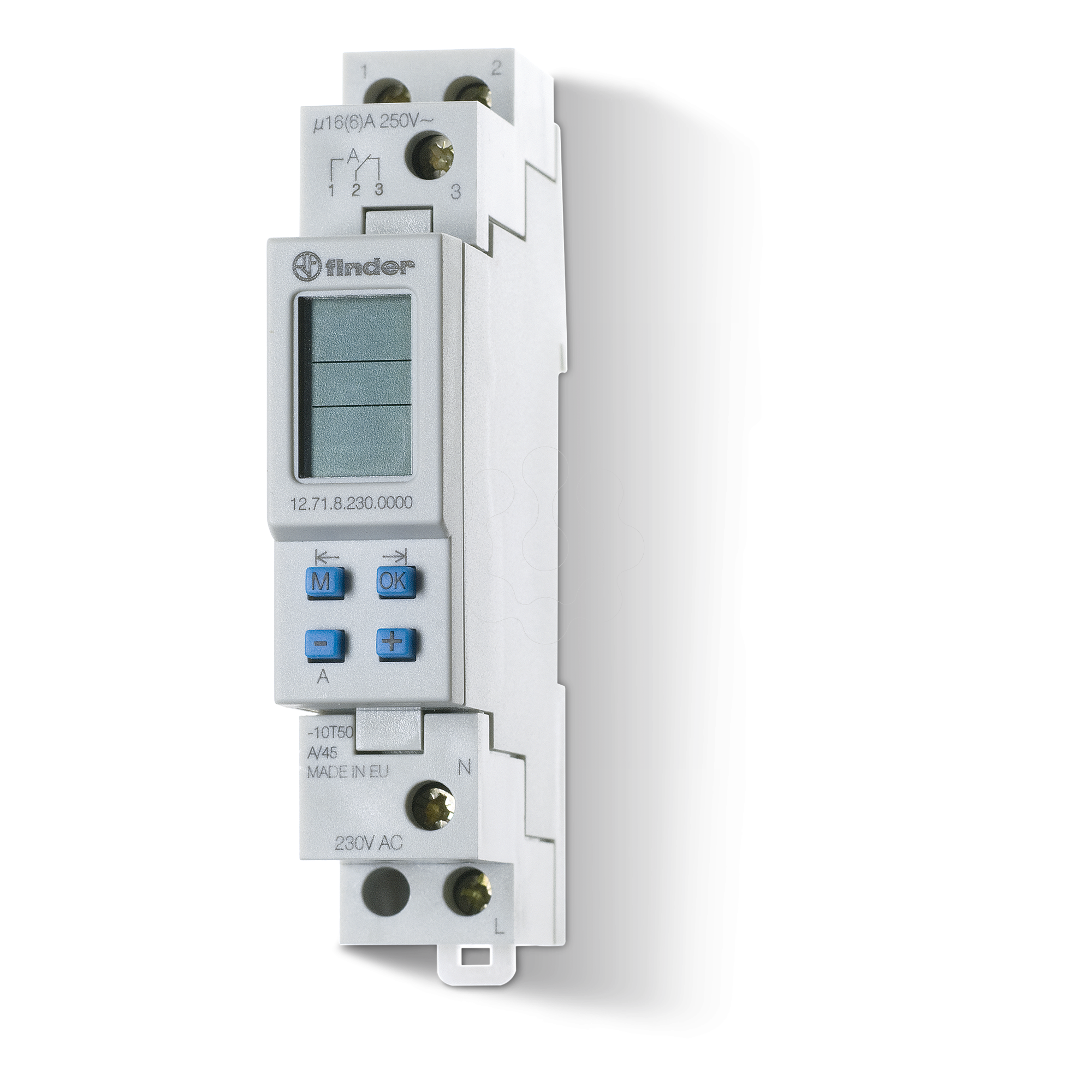 Programador horário Nr.contato: 1 reversível Material dos contatos: AgNi Método de montagem: Calha DIN Número de canais: 1 Programa semanal: sim Programa anual: não Largura em número de módulos: 1 Programa de 60 min: sim Rede síncrona: não Controlado por quartzo: sim Mudança automática de verão/inverno: sim Operação manual: sim Tipo de tensão de alimentação: AC Contato livre de potencial: sim Tensão de alimentação: 230 V. Frequência da tensão de alimentação: de 50 a 60 Hz. Canal de tempo de comutação mais curto 1: 1 min. Corrente nominal de comutação a 250 V CA: 16 A. Grau de proteção (IP): IP20 Precisão diária: 0.5 s.