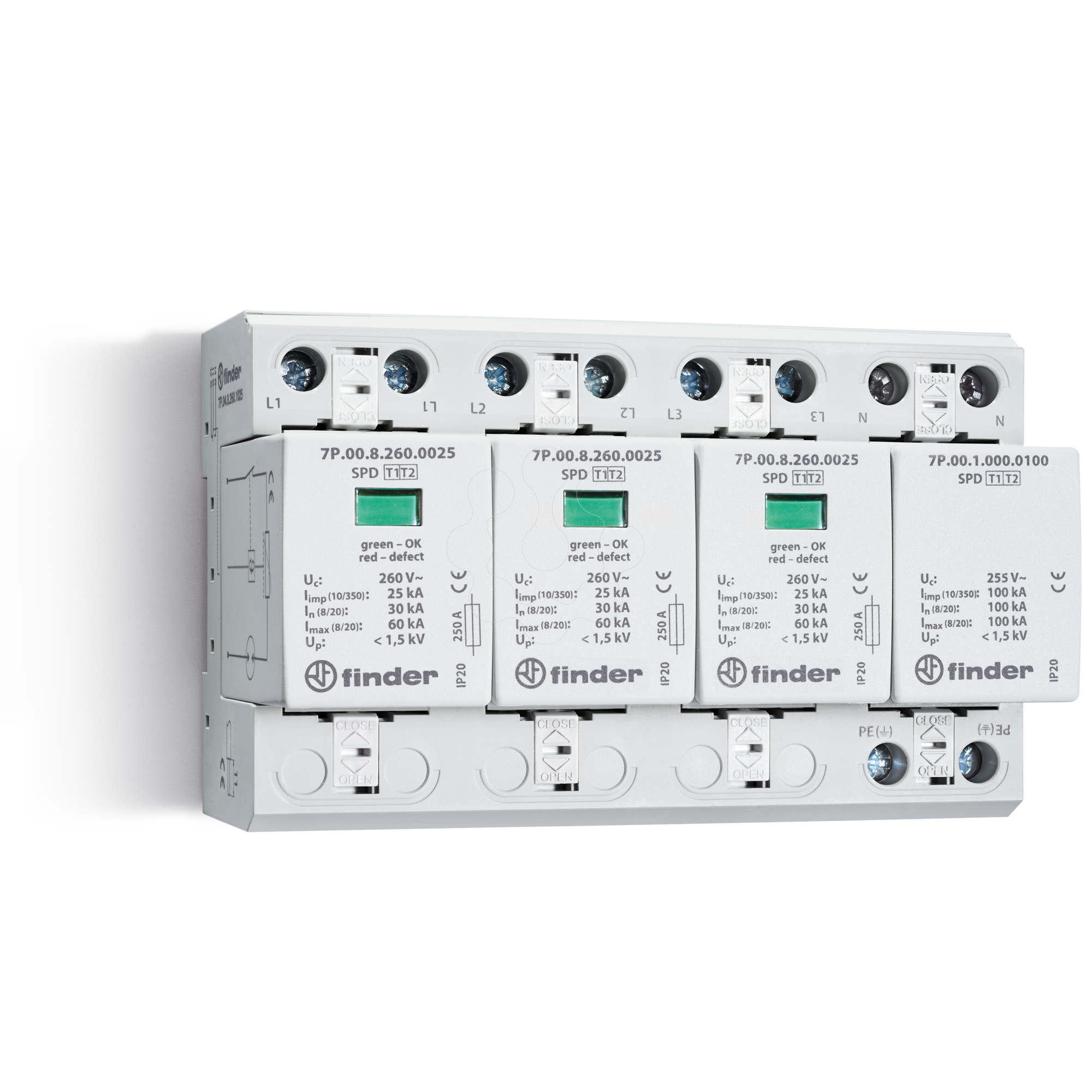 Dispositivo de Proteção contra Surtos Método de montagem: Perfil DIN 35 mm Com contato de sinalização remota: sim Número de condutores (Sem aterramento): 4 Tamanho: 8 espAços modulares Tensão máxima contínua AC: 260 V. Corrente de descarga nominal (8/20): 30 kA. Tensão nominal CA: 230 V. Ensaio de categoria tipo 2: não Nível de proteção L-N: 1.5 kV. Sinalização no nível do dispositivo: Ótico Grau de proteção (IP): IP20 Nível de proteção de tensão N-PE: 1.5 kV. Fusível de backup integrado: não Esquema de ligação DC: não Esquema de ligação TI: não Esquema de ligação TN: não Esquema de ligação TN-C: não Esquema de ligação TN-S: sim Esquema de ligação TT: sim Configuração de outro esquema de ligação: não Esquema de ligação TN-C-S: não Corrente de choque de descarga máxima (8/20): 60 kA. Resistência a curto-circuito (Isccr): 50 kA.