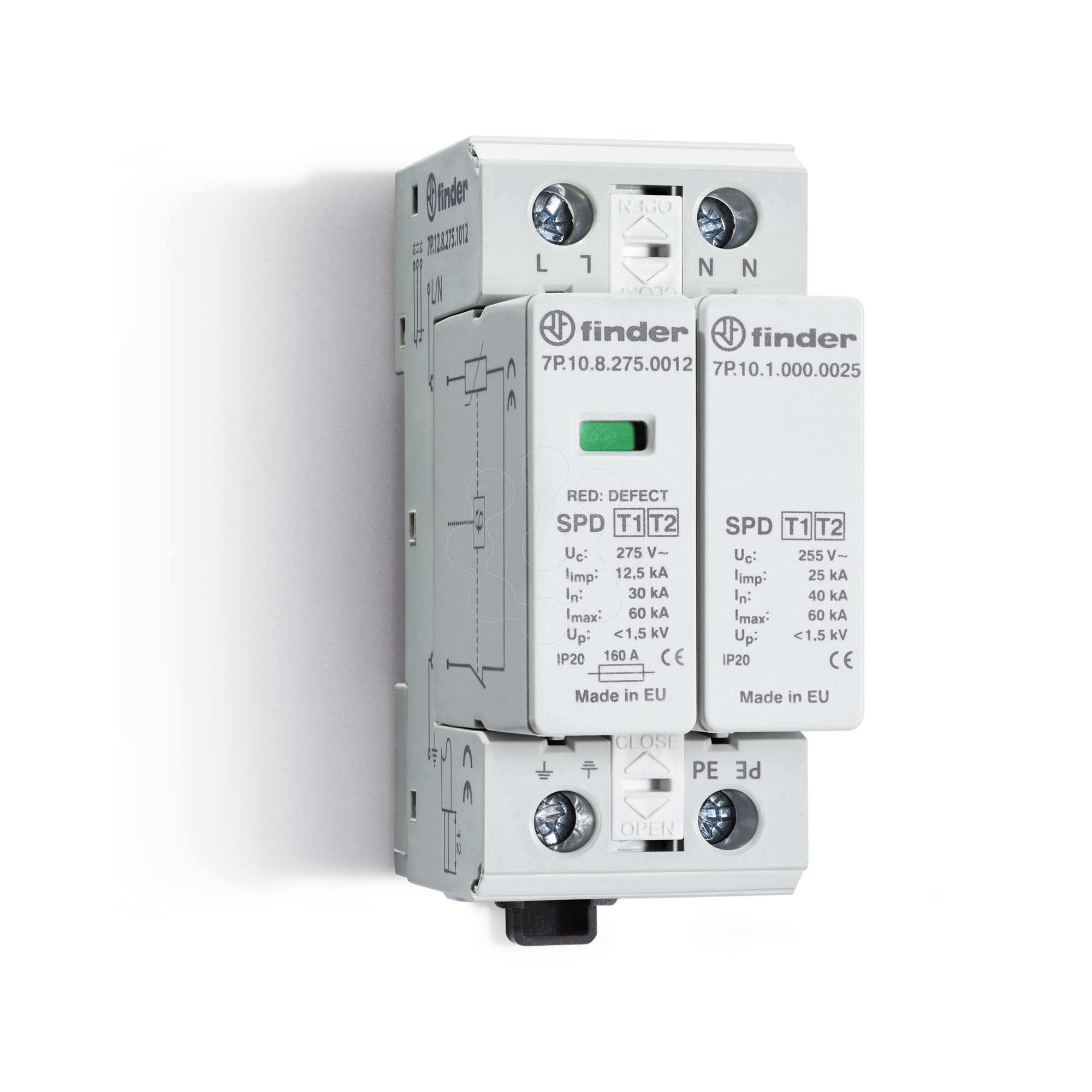 Dispositivo de Proteção contra Surtos Método de montagem: Perfil DIN 35 mm Com contato de sinalização remota: sim Número de condutores (Sem aterramento): 2 Tamanho: 2 espaços modulares Tensão máxima contínua AC: 275 V. Corrente de descarga nominal (8/20): 30 kA. Tensão nominal CA: 230 V. Ensaio de categoria tipo 2: não Nível de proteção L-N: 1.2 kV. Sinalização no nível do dispositivo: Ótico Máxima tensão DC contínua: 350 V. Grau de proteção (IP): IP20 Nível de proteção de tensão N-PE: 1.5 kV. Fusível de backup integrado: não Esquema de ligação DC: não Esquema de ligação TI: não Esquema de ligação TN: não Esquema de ligação TN-C: não Esquema de ligação TN-S: sim Esquema de ligação TT: sim Configuração de outro esquema de ligação: não Esquema de ligação TN-C-S: não Corrente de choque de descarga máxima (8/20): 60 kA. Resistência a curto-circuito (Isccr): 50 kA.
