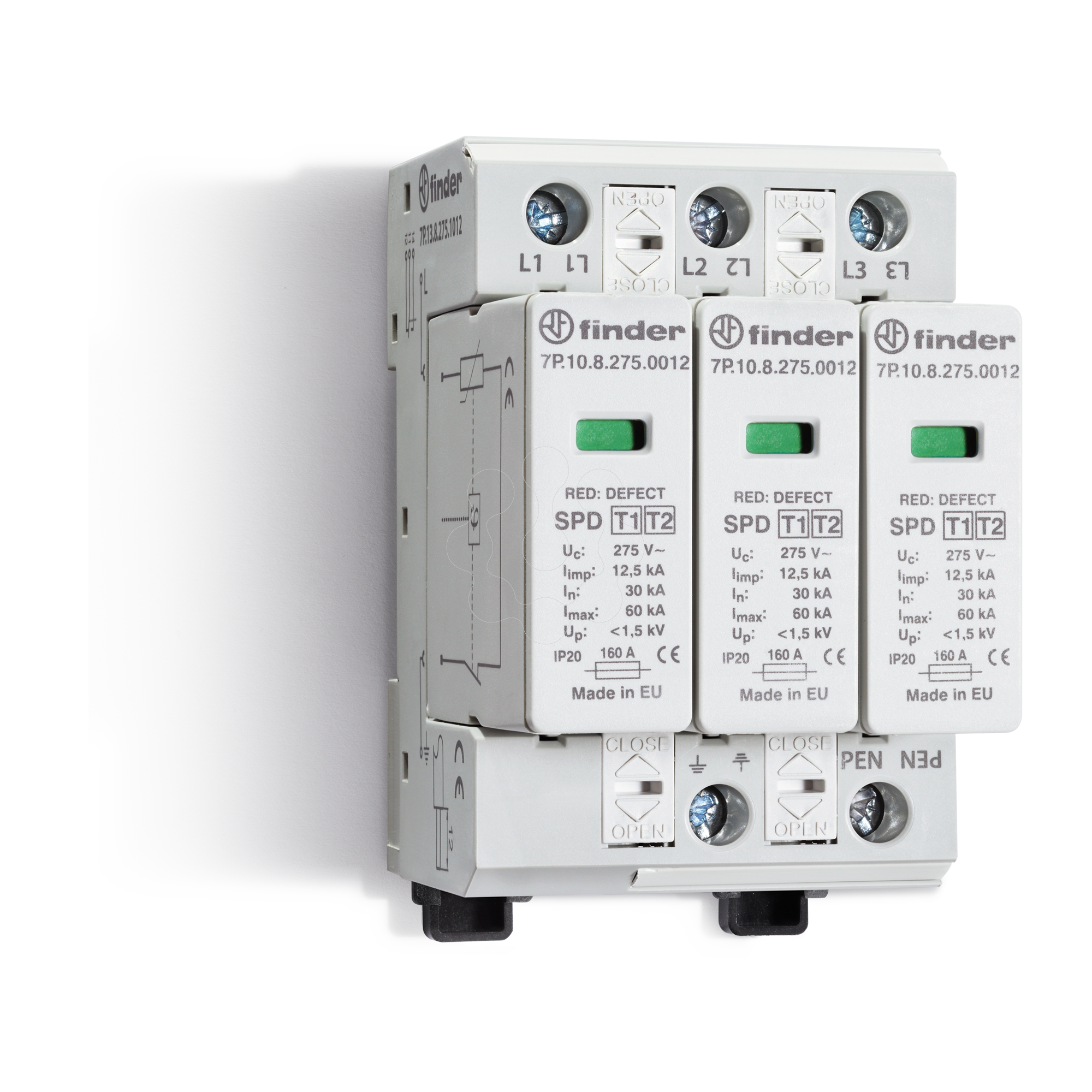 Dispositivo de Proteção contra Surtos Método de montagem: Perfil DIN 35 mm Com contato de sinalização remota: sim Número de condutores (Sem aterramento): 3 Tamanho: 3 espaços modulares Tensão máxima contínua AC: 275 V. Corrente de descarga nominal (8/20): 30 kA. Tensão nominal CA: 230 V. Ensaio de categoria tipo 2: não Nível de proteção L-N: 1.2 kV. Sinalização no nível do dispositivo: Ótico Máxima tensão DC contínua: 350 V. Grau de proteção (IP): IP20 Nível de proteção de tensão N-PE: 1.2 kV. Fusível de backup integrado: não Esquema de ligação DC: não Esquema de ligação TI: não Esquema de ligação TN: sim Esquema de ligação TN-C: sim Esquema de ligação TN-S: não Esquema de ligação TT: não Configuração de outro esquema de ligação: não Esquema de ligação TN-C-S: sim Corrente de choque de descarga máxima (8/20): 60 kA. Resistência a curto-circuito (Isccr): 50 kA.