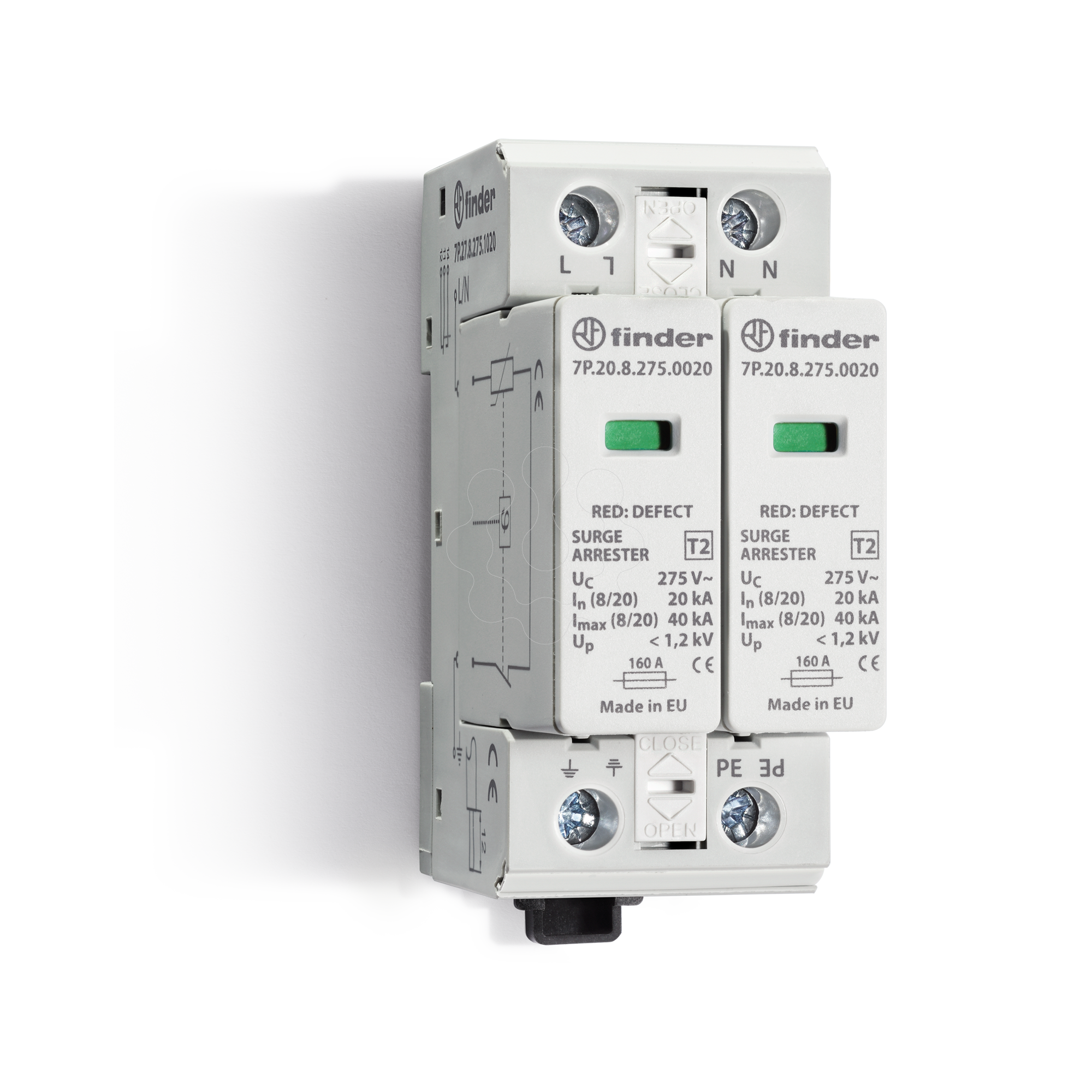 Dispositivo de Proteção contra Surtos Método de montagem: Perfil DIN 35 mm Com contato de sinalização remota: sim Número de condutores (Sem aterramento): 2 Tamanho: 2 espaços modulares Tensão máxima contínua AC: 275 V. Corrente de descarga nominal (8/20): 20 kA. Tensão nominal CA: 230 V. Ensaio de categoria tipo 2: sim Nível de proteção L-N: 1.2 kV. Sinalização no nível do dispositivo: Ótico Grau de proteção (IP): IP20 Nível de proteção de tensão N-PE: 1.2 kV. Fusível de backup integrado: não Esquema de ligação DC: não Esquema de ligação TI: não Esquema de ligação TN: sim Esquema de ligação TN-C: sim Esquema de ligação TN-S: não Esquema de ligação TT: não Configuração de outro esquema de ligação: não Esquema de ligação TN-C-S: não Corrente de choque de descarga máxima (8/20): 60 kA. Resistência a curto-circuito (Isccr): 50 kA.