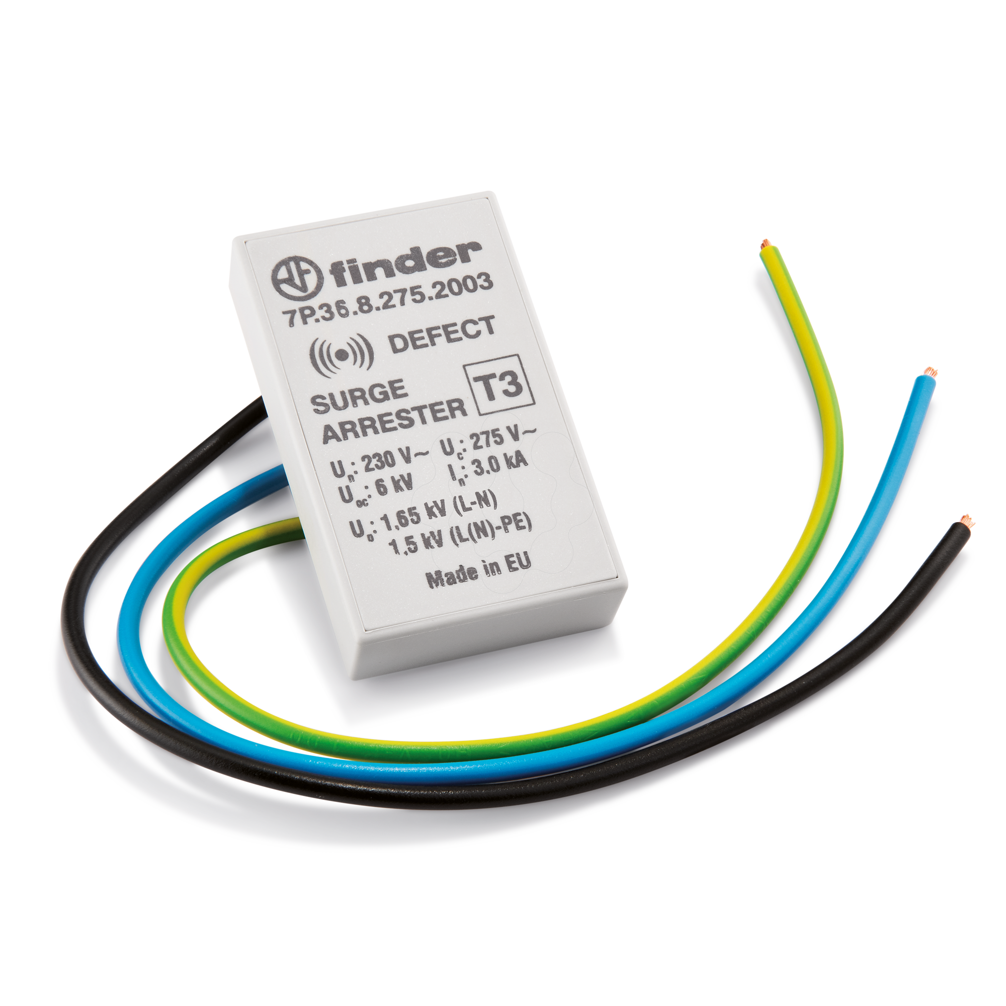 Dispositivo de Proteção contra Surtos Método de montagem: Montagem em superfície/montagem embutida Com contato de sinalização remota: não Número de pólos: 1 Tensão máxima contínua AC: 275 V. Corrente de descarga nominal (8/20) (L-N): 3 kA. Tensão nominal CA: 230 V. Ensaio de categoria tipo 1: sim Nível de proteção L-N: 1.65 kV. Sinalização no nível do dispositivo: Acústico Grau de proteção (IP): IP20 Com filtro supressor de interferências: não