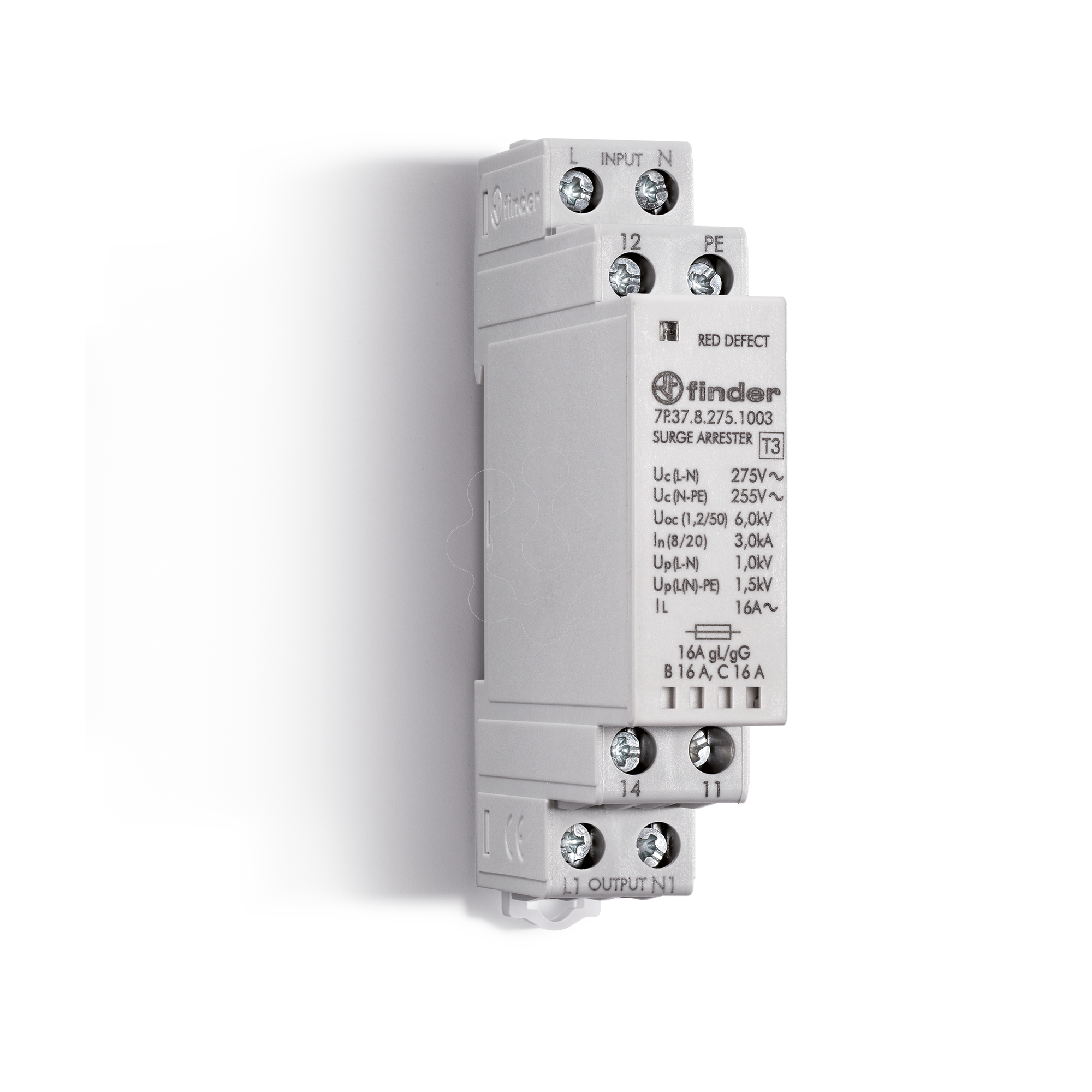 Dispositivo de Proteção contra Surtos Método de montagem: Perfil DIN 35 mm Com contato de sinalização remota: sim Número de pólos: 1 Tensão máxima contínua AC: 275 V. Corrente de descarga nominal (8/20) (L-N): 3 kA. Tensão nominal CA: 230 V. Ensaio de categoria tipo 1: sim Nível de proteção L-N: 1 kV. Sinalização no nível do dispositivo: Ótico Grau de proteção (IP): IP20 Com filtro supressor de interferências: não