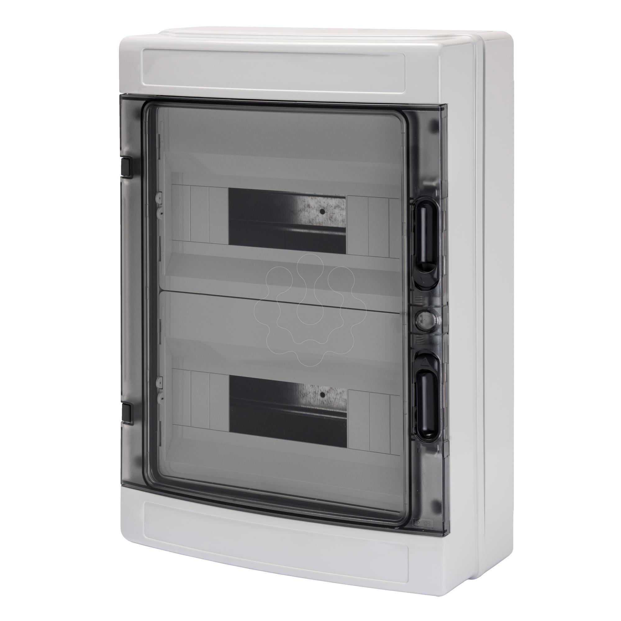 "Série 40 CD - Caixas e painéis de distribuição de montagem saliente - A série 40CD de painéis de distribuição de montagem saliente, disponível nas versões com porta transparente fumada ou cega e em tamanhos de 8 a 72 módulos, garante uma integração estética em todos os tipos de ambientes. A oferta inclui: 40CDK - IP65 - quadros estanques com caixilho amovível (a partir de 24M), painéis seláveis, acessíveis com condutas de cablagem, fechadura, tampas estéticas e painéis cegos