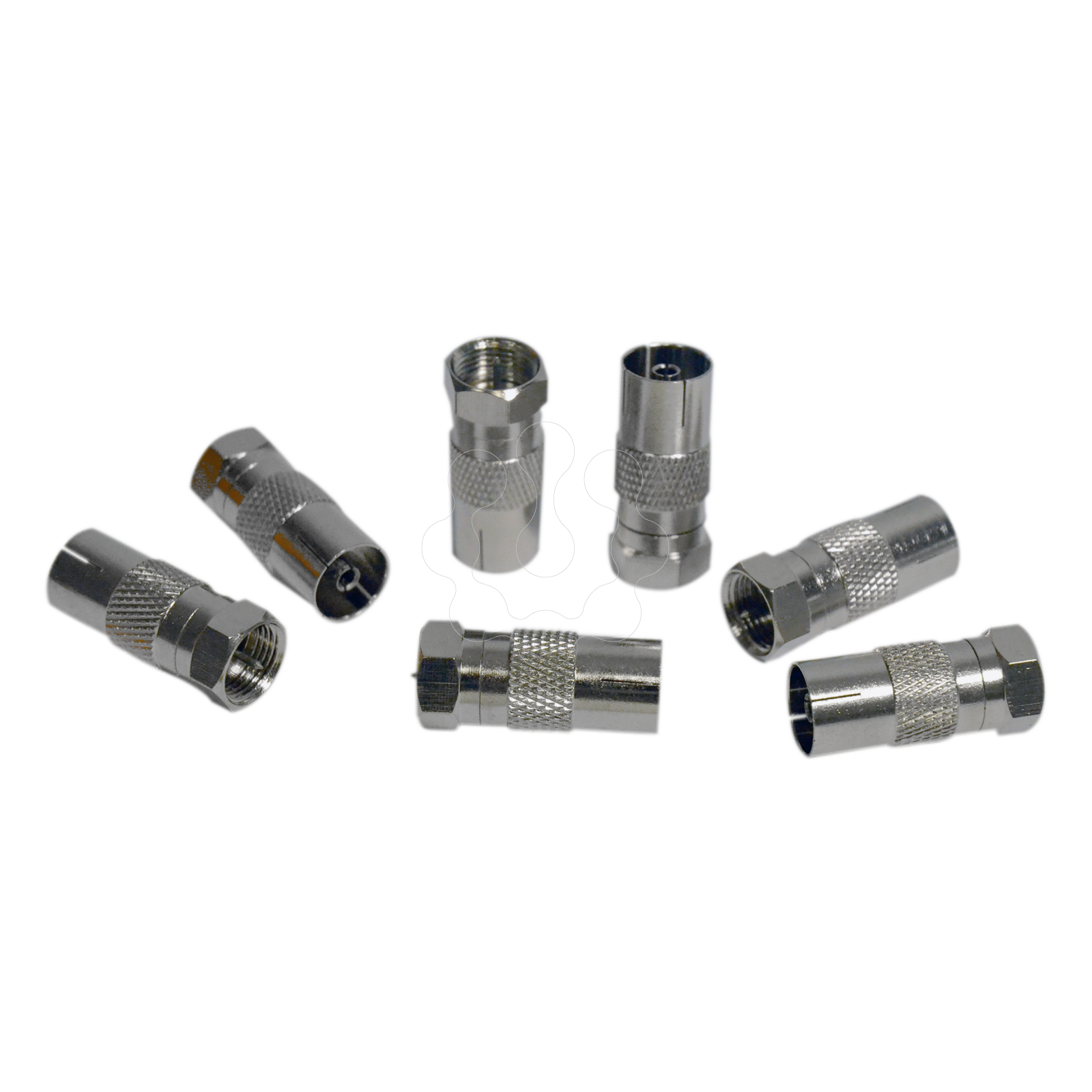 Adaptador ''F'' macho - ''CEI'' fêmea. Adaptador ''F'' macho - ''CEI'' fêmea . Adaptador que permite converter uma conexão ''F'' em ''CEI'' fêmea, tipicamente para trocar o tipo de conexão de um equipamento. Fornecido em caixa plástica profissional de 50 uds.