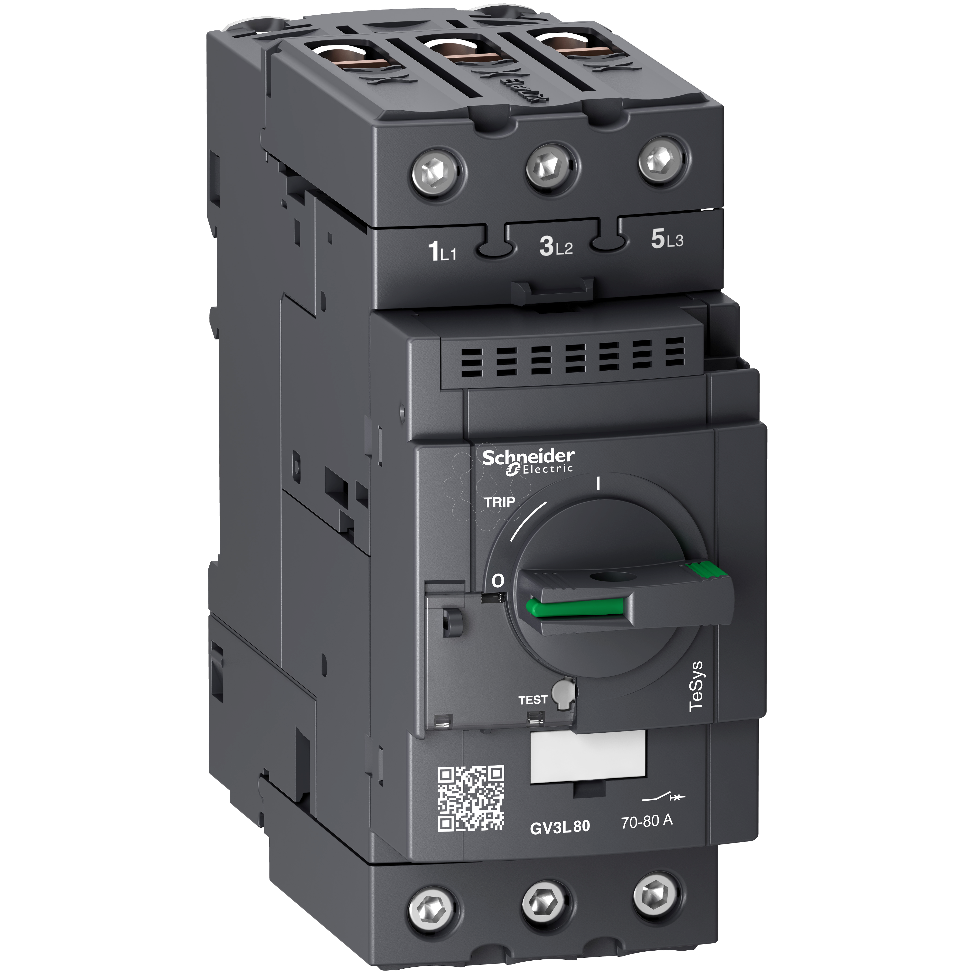 Os disjuntores motores ,Tesys ,Deca podem ser facilmente integrados em várias configurações, graças a sua largura padrão de 55 mm e montagem em trilho DIN. Além de contar com acessórios de barramento completos para conexão rápida. Este produto possui 3 polos, capacidade de 80A/690V e está destinado para aplicações de motor trifásico 45kW/400V. Fornece uma proteção magnética com uma gama de regulação térmica 80A, disparo magnético a 14xIn e alta capacidade de ruptura Icu 100kA@400V. Além disso, conta com proteção IP20 e conexão por meio de terminais parafusos Everlink BTR. Também permite o controle de inicio/parada por manopla rotativa garantida por 50.000 ciclos AC-3. Para completar a proteção do motor, utilize-o em associação com um relé de sobrecarga térmica LRD380 (a ser encomendado separadamente). Este produto tem certificação multipadrão (IEC, UL, CSA, CCC, EAC, Marine). Os disjuntores motor Tesys Deca levam o selo Green PremiumTM, que promete conformidade com as mais recentes regulamentações, transparência nos impactos ambientais, produtos circulares e de baixo CO2.