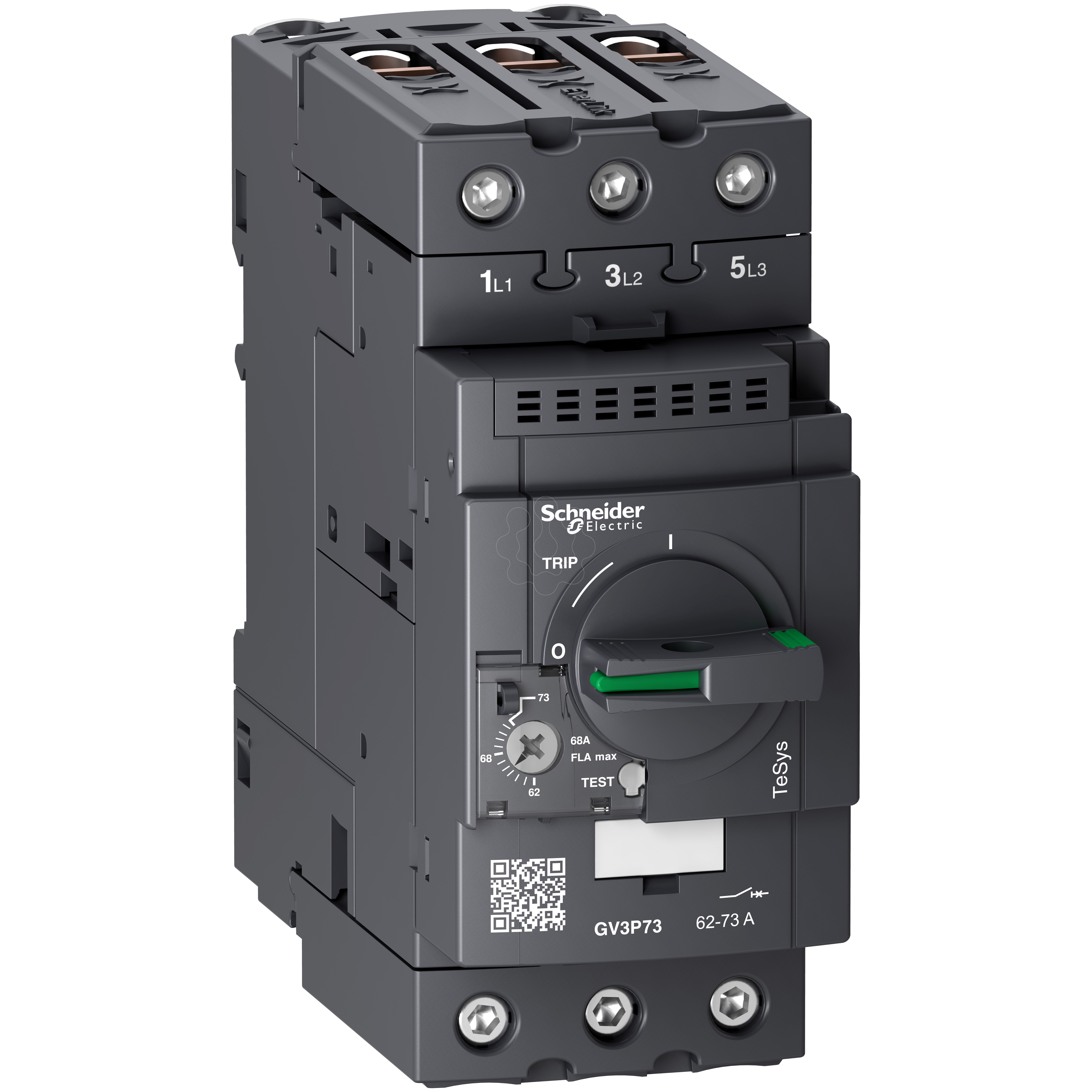 Os disjuntores motores ,Tesys ,Deca podem ser facilmente integrados em várias configurações, graças a sua largura padrão de 55 mm e montagem em trilho DIN. Além de contar com acessórios de barramento completos para conexão rápida. Este produto possui 3 polos, capacidade de 70-80A/690V e está destinado para aplicações de motor trifásico 37kW/400V. Fornece uma proteção termomagnética com uma gama de regulação térmica 70-80A, disparo magnético a 14xIn e alta capacidade de ruptura Icu 100kA@400V. Além disso, conta com proteção IP20 e conexão por meio de terminais parafusos Everlink BTR. Também permite o controle de inicio/parada por manopla rotativa garantida por 50.000 ciclos AC-3. Este produto tem certificação multipadrão (IEC, UL, CSA, CCC, EAC, Marine). Os disjuntores motor Tesys Deca levam o selo Green PremiumTM, que promete conformidade com as mais recentes regulamentações, transparência nos impactos ambientais, produtos circulares e de baixo CO2.