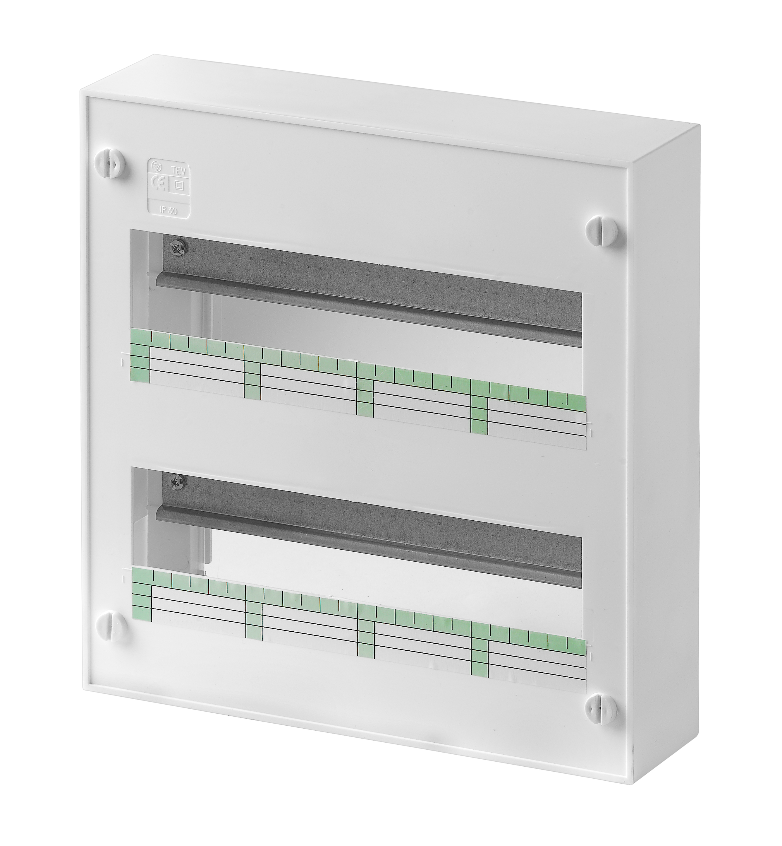 QDR DIST SAL MINI S 24 MÓD BRC. QUADRO DE DISTRIBUIÇÃO SALIENTE 24 MÓDULOS BRANCO. Em conformidade com a norma EN 61439-3 Para montagem saliente Fabricados em termoplástico Cor: branco RAL 9010 2 filas, 24 módulos Instalação de equipamentos em calha (35 mm) EN50022 Caracteristicas mecânicas: material poliestireno Tensão de isolamento 400V Humidade máxima (50%HR a + 40ªC) Classe II de isolamento IP30/IK07 Sem halogéneos Acessórios incluidos: Equipado com ligador T/N para ref.2024 - ref: SLG16F Etiqueta para identificação do circuito