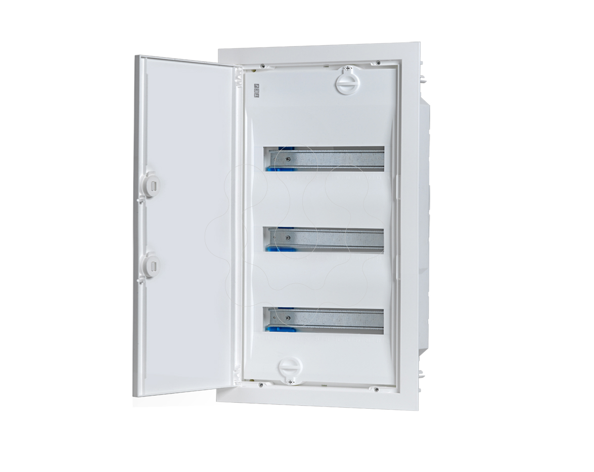 QDR DIST EMB PT OPC 3F 42M BRC. QUADRO DE DISTRIBUIÇÃO MONTAGEM EMBUTIDA PORTA OPACA 3 FILAS 42 MÓDULOS BRANCO. Em conformidade com a norma EN 61439-3 Para montagem de embutir Fabricado em termoplástico Cor: branco RAL 9010 3 filas, 42 módulos Porta opaca, porta com aro reversível Instalação de equipamentos em calha DIN (35 mm) EN50022. Distância entre calhas 150mm Caracteristicas mecânicas: material poliestireno Tensão de isolamento 400V Humidade máxima (50%HR a + 40ªC) Classe II de isolamento IP41/IK07 Sem halogéneos Acessórios incluidos: Equipado com ligador T/N - Ref: SL16N16T Etiqueta para identificação do circuito Opção: Cor cinza RAL 7035 Ligador rápido fixconnect