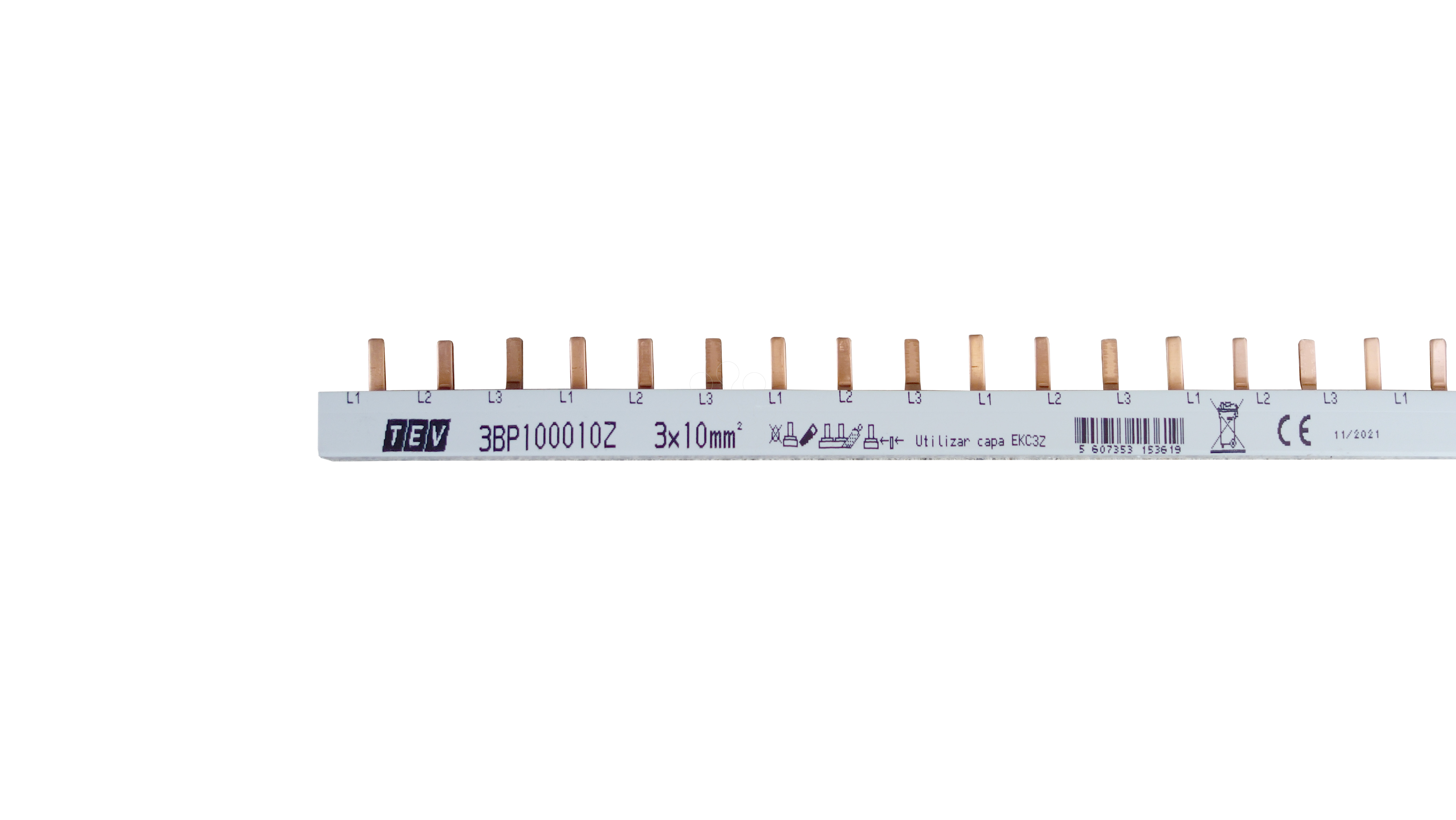 BARR PONT 10 mm² 1000 mm 3P. BARRAMENTO DE PONTEIRA 10mm² 1000mm TRIPOLAR. Em conformidade com a norma EN 61439-1-6 Cobre Eº CU S8/F25 - DIN 1787 Isolamento em plástico auto-extinguível - Ultramid Resistência a curto circuitos <25KA Sem halogéneos