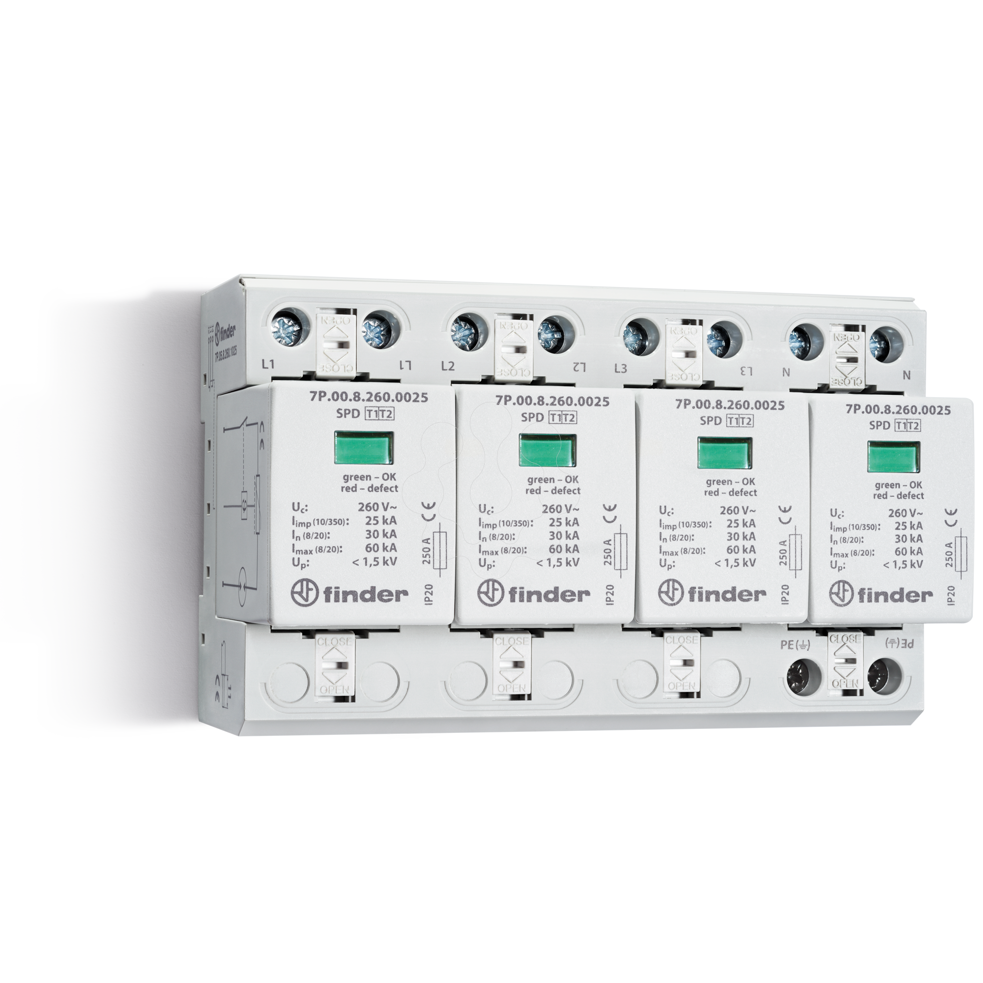 Dispositivo de Proteção contra Surtos Método de montagem: Perfil DIN 35 mm Com contato de sinalização remota: sim Número de condutores (Sem aterramento): 4 Tamanho: 8 espAços modulares Tensão máxima contínua AC: 260 V. Corrente de descarga nominal (8/20): 30 kA. Tensão nominal CA: 230 V. Ensaio de categoria tipo 2: não Nível de proteção L-N: 1.5 kV. Sinalização no nível do dispositivo: Ótico Grau de proteção (IP): IP20 Nível de proteção de tensão N-PE: 1.5 kV. Fusível de backup integrado: não Esquema de ligação DC: não Esquema de ligação TI: não Esquema de ligação TN: não Esquema de ligação TN-C: não Esquema de ligação TN-S: sim Esquema de ligação TT: não Configuração de outro esquema de ligação: não Esquema de ligação TN-C-S: não Corrente de choque de descarga máxima (8/20): 60 kA. Resistência a curto-circuito (Isccr): 50 kA.