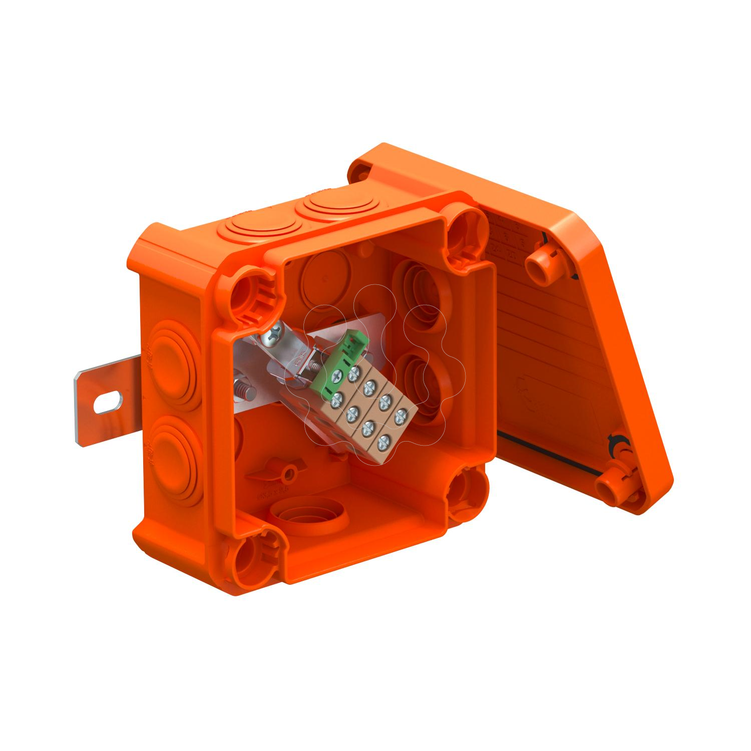 Caixa de derivação com bornes cerâmicos simples e bucins cónicos. Espaço de cablagem suficiente, através de uma unidade de ligação diagonal com bornes cerâmicos resistentes a elevadas temperaturas completamente pré-montados. Borne para condutor de proteção identificado a verde-amarelo. Fixação a chapas exteriores facilmente acessíveis. Aprovado para instalações de cabos com manutenção de funções elétricas de acordo com a DIN 4102 parte 12 com as classes E30, E60 e E90. Os bornes cerâmicos foram testados segundo a DIN EN 60998-2-1:2004.