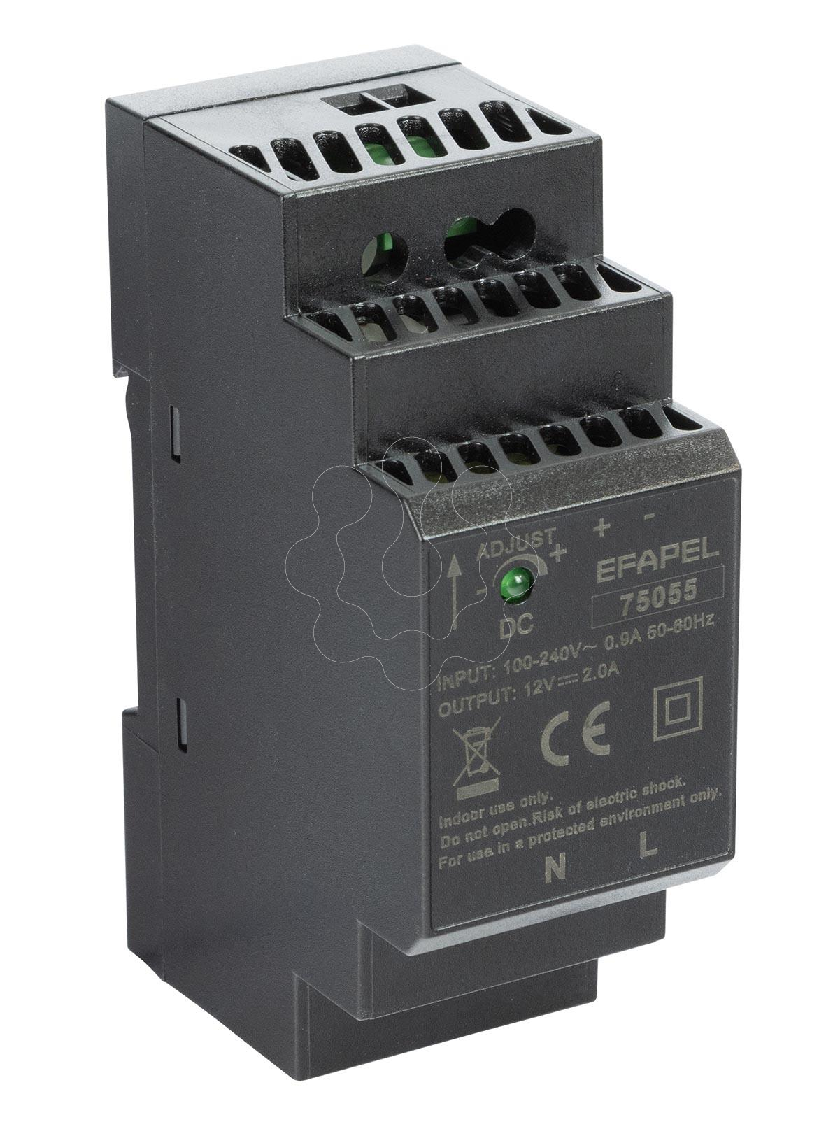Fonte de Alimentação 75055. Fonte de Alimentação para Calha DIN 12 V 24 W. Entrada: 100-240 V ~ | 50 - 60 Hz Saída: 12 V - 24 W - 2 A Até 1 Central de Som e 4 Comandos Ocupa 2 módulos DIN